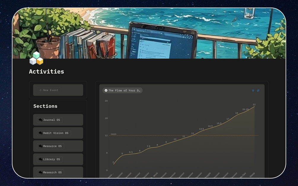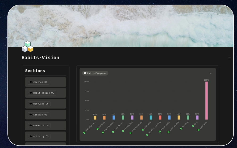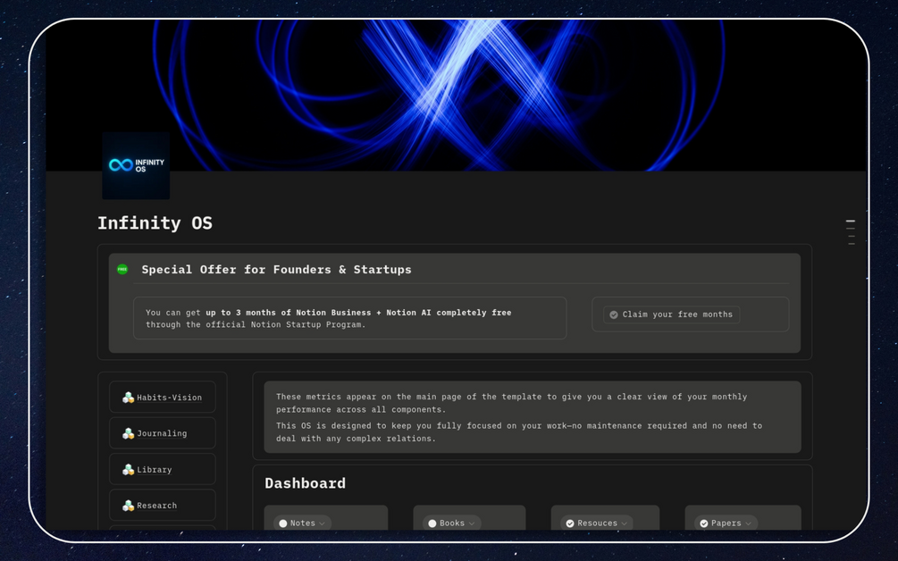 Infinity OS is a zero-maintenance visual dashboard for your entire life. Track habits, books, projects, courses, goals, daily events, resources and research papers with beautiful, automated charts. No complex setup just focus on your growth.