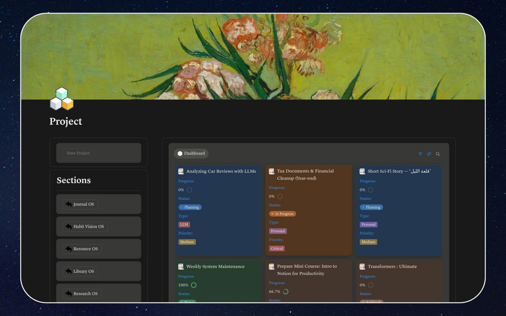 - 🎯 Goals & Projects: Connect your high-level goals to active projects. Use the visual dashboard to track status, priority, and completion rates.