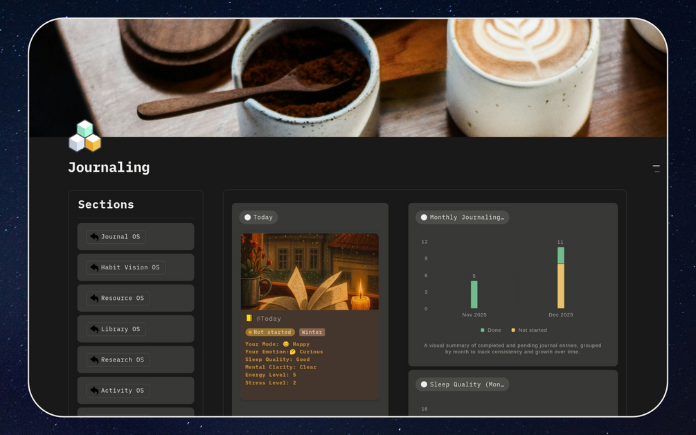 - 🧠 Journaling: Log your daily thoughts, mood, and sleep quality, and see how they trend over the month.