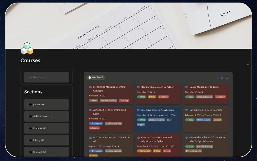 - 🎓 Courses & Research Papers: specialized tools for students and lifelong learners to manage studies and academic citations.