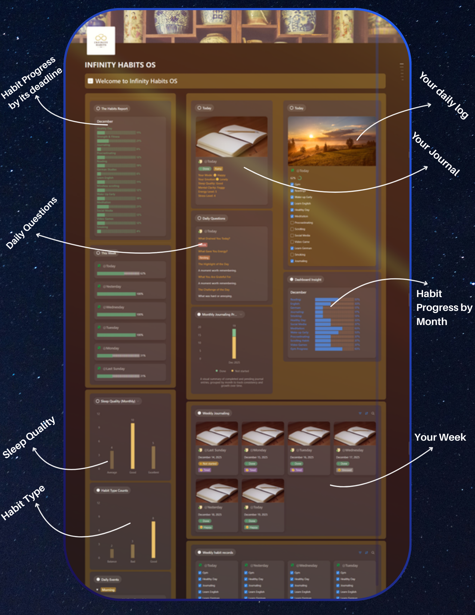 Infinity Habits OS is more than a tracker , it’s a full habit performance operating system built inside Notion.