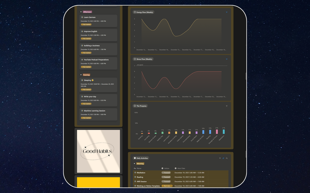 Beautiful dashboards visualize your consistency, energy levels, and mood insights — making it easy to reflect and adjust.